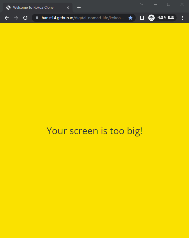 When viewed on oversized screens, the app gracefully displays: "Your screen is too big!" — helping preserve mobile-focused UX fidelity.
