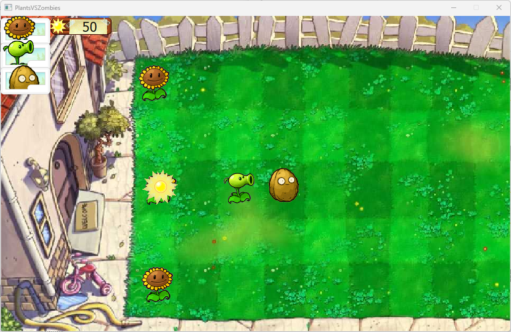 - Resource Management: Sun points are collected and spent to place plants on a grid-based lawn.