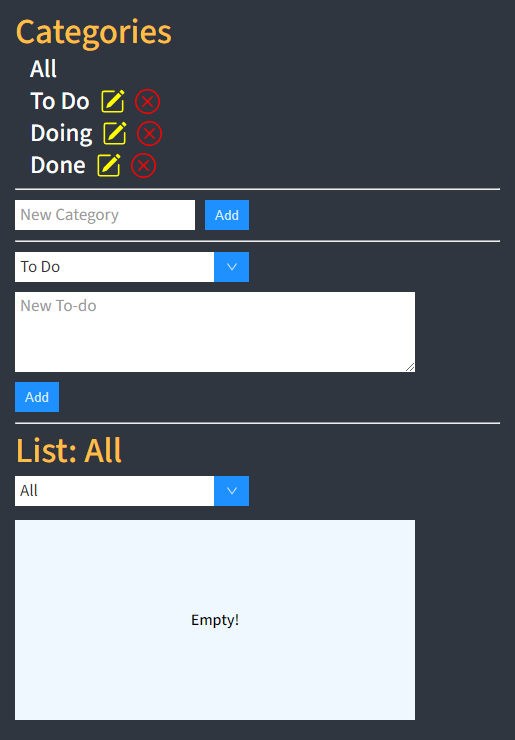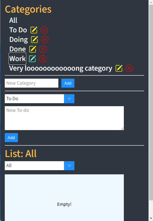 To Do, Doing, Done, and All (non-removable). - Custom category support: Add, rename, and delete any categories except "All".