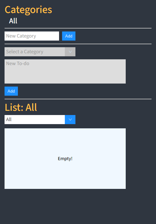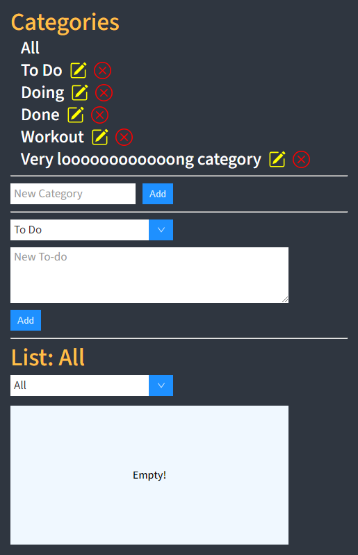 A polished, fully interactive to-do list application built with React, allowing users to manage tasks through customizable and searchable categories. It offers both simplicity and flexibility, aiming to strike a balance between clean UI and useful features. Perfect for experimenting with category-based filtering, persistent state, and intuitive UX patterns.