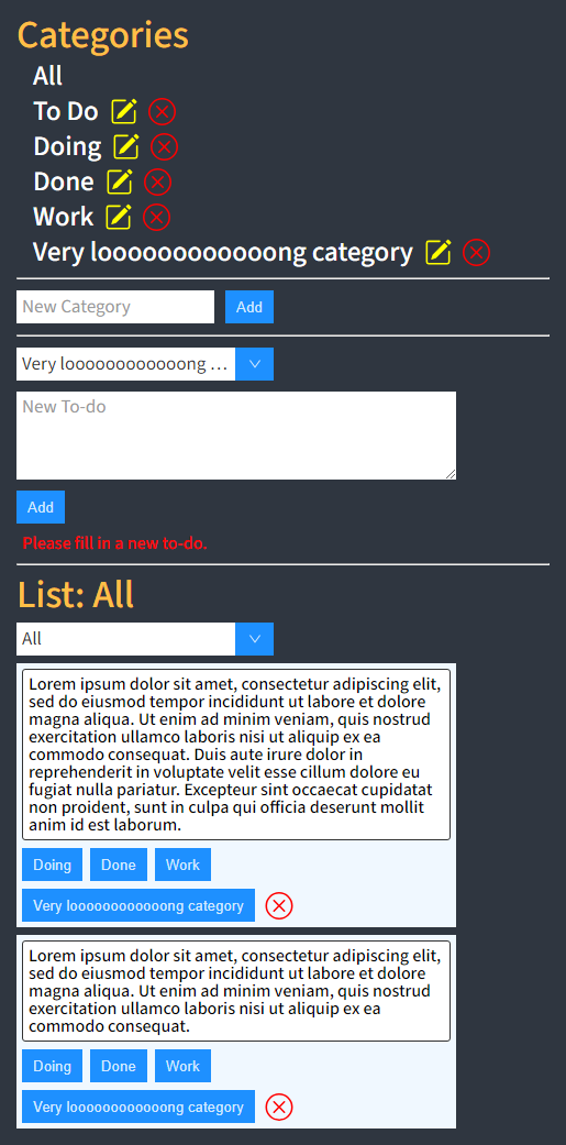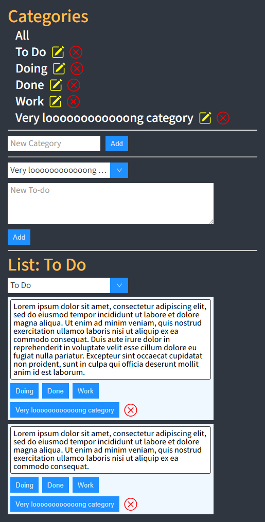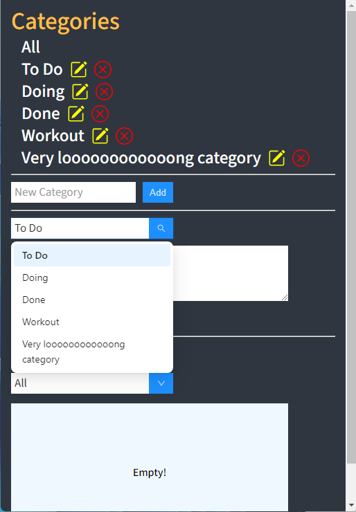 - Long category name support: Handles overflow gracefully in dropdowns and UI. Add extremely long category names and still have them fit within UI constraints (e.g., "Very loooooooooooong category" works fine in dropdowns and badges).