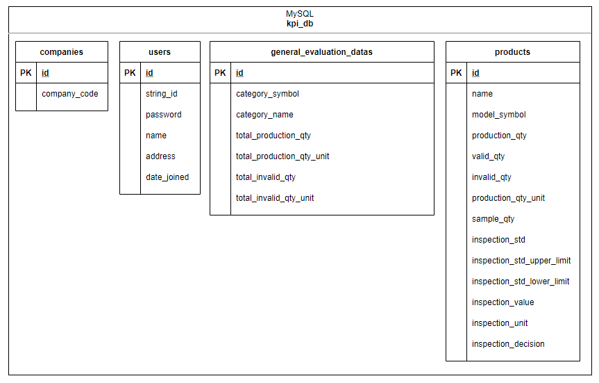 The system integrates with a MySQL database (kpi_db) consisting of: