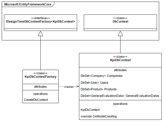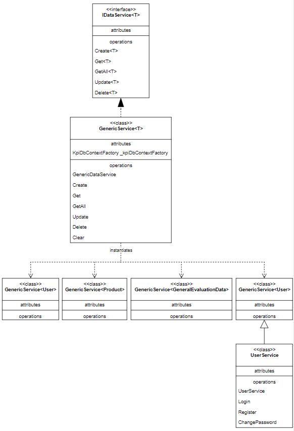 companies, users for authentication and user management.general_evaluation_datas and products for storing raw evaluation records.KpiDbContext, DbSet<T> abstraction, and migration-ready KpiDbContextFactory.GenericService<T> and IDataService<T> interfaces for CRUD operations across multiple entity types.UserService, SystemService and KpiApiService for business logic encapsulation.The core KpiApiService handles: