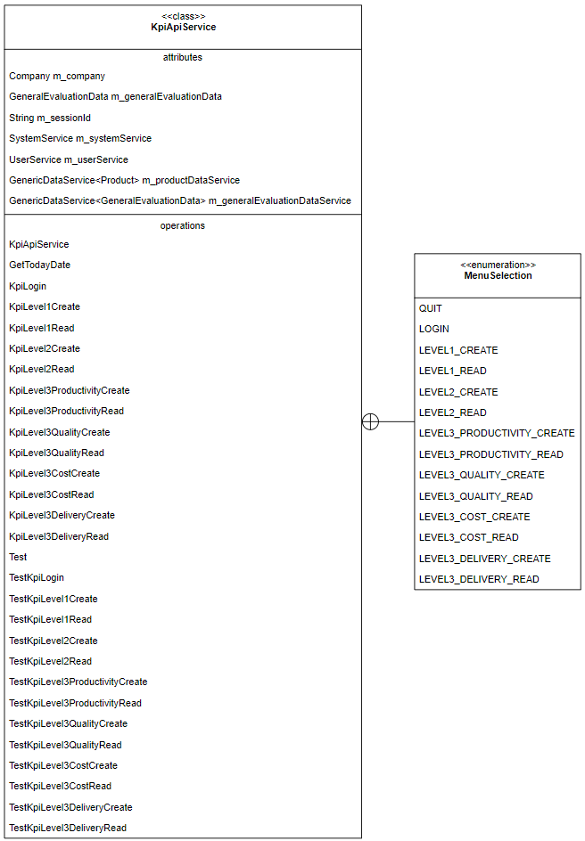 LEVEL3_QUALITY_CREATE).KpiApiResultData with log printouts and error tracking via Error subclasses.Company, Product, GeneralEvaluationData, etc., form the domain core.GenericService<T> resolves data operations based on passed DbContextFactory.UserService.Login()).KpiLevel3xxxCreate() methods.Print() and PrintLog() methods in KpiApiResultData.