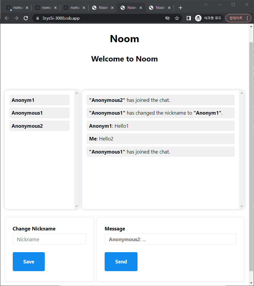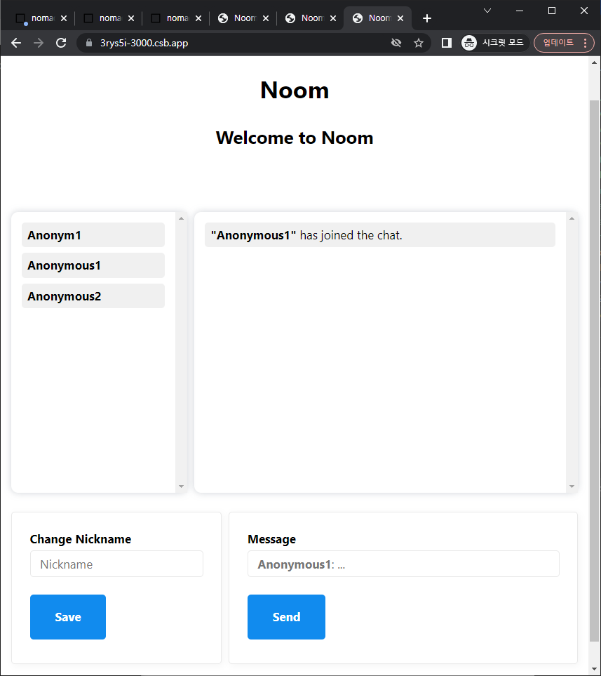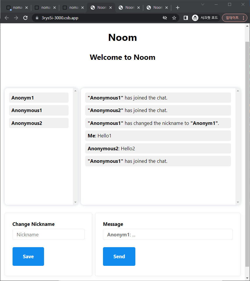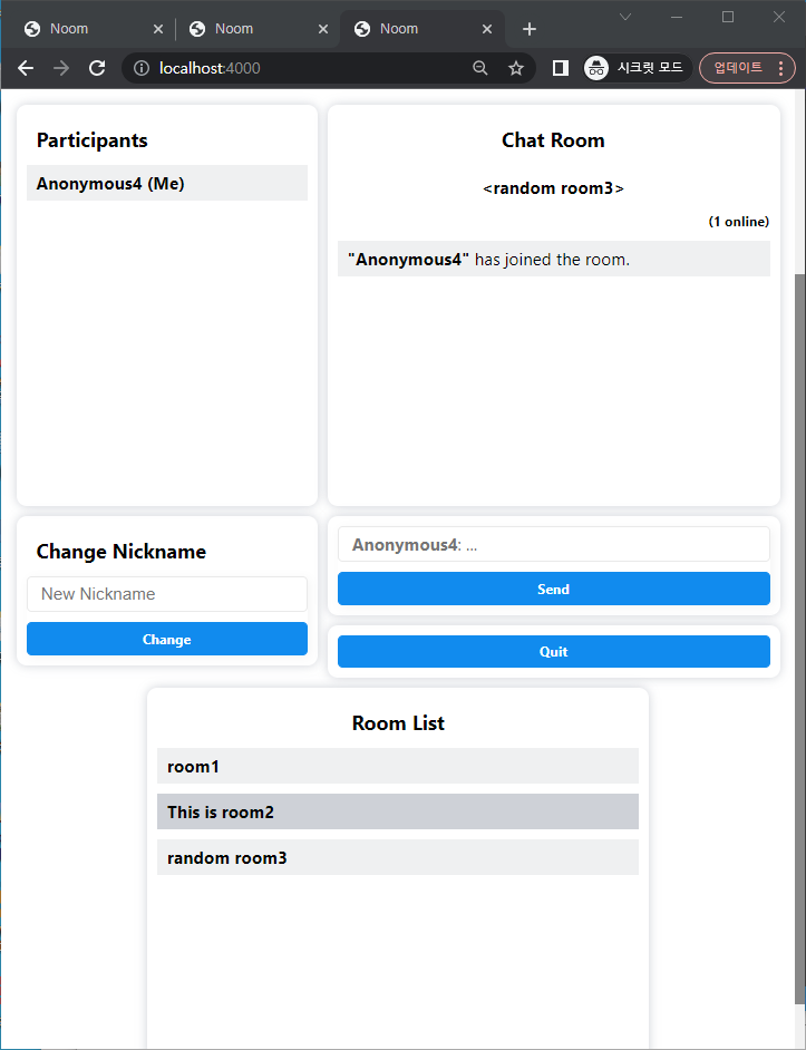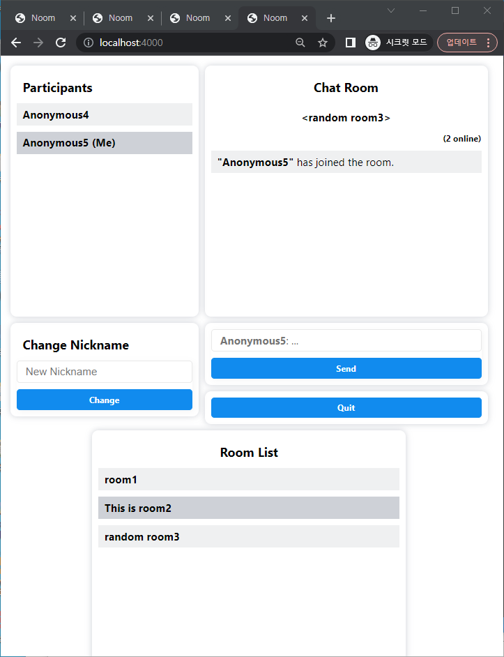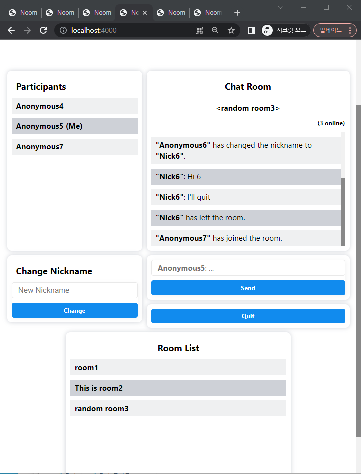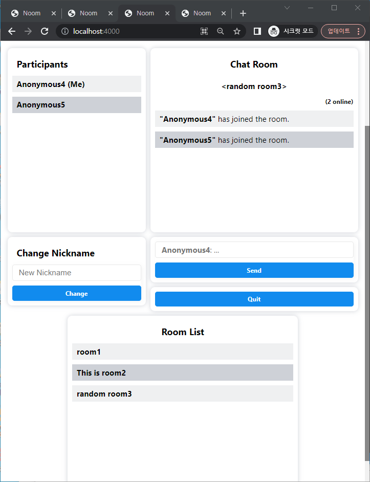 Text-based chat with dynamic room creation, nickname validation, and participant lists.