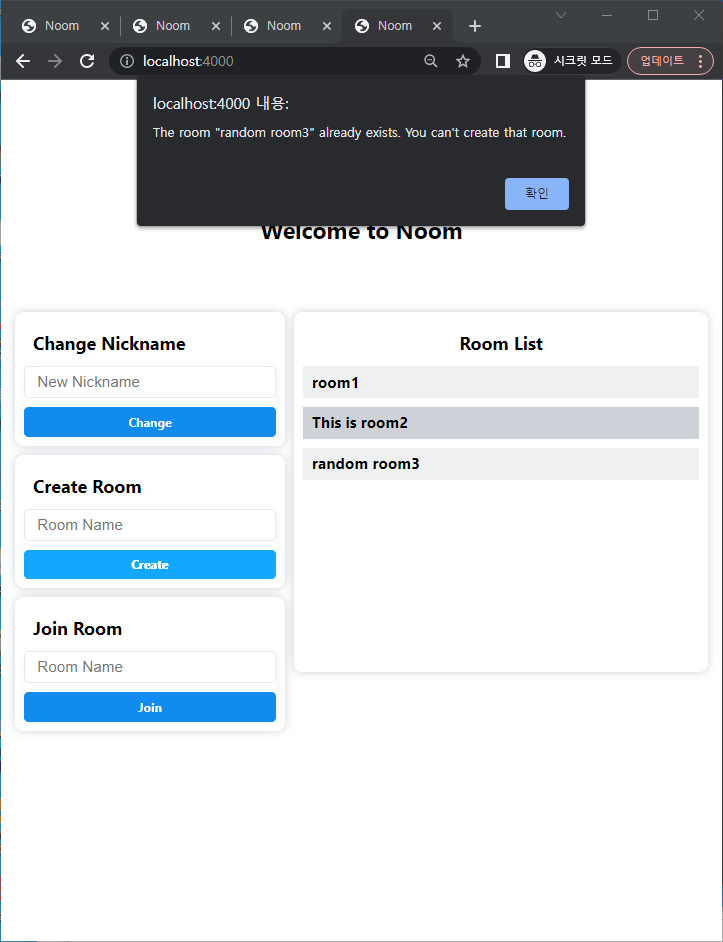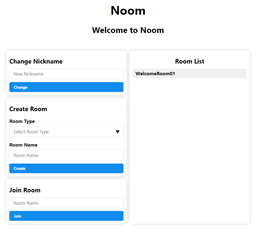 Displays live room lists, handles duplicate room name prevention, and supports room join/quit actions with live feedback.